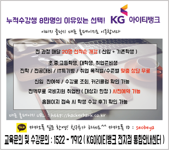안녕하세요 kG아이티뱅크교육기관입니다.