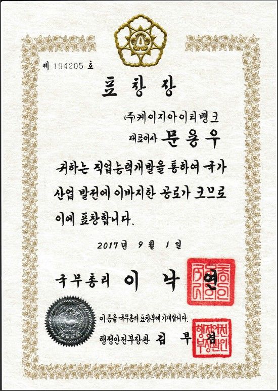 국가 산업발전에 공로가 크다는 표창을 수여 받았습니다.