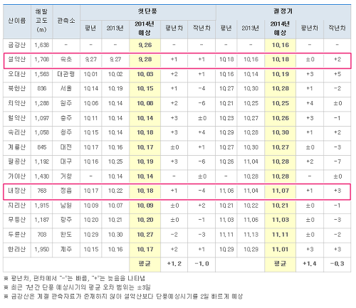 최근 7년간 단풍 예상시기의 평균 오차는 ±3일