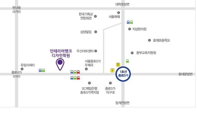종로5가에 위치하고 있으며 종로점과 부산점에서 웹디자인에 대한 교육을 진행하고 있습니다